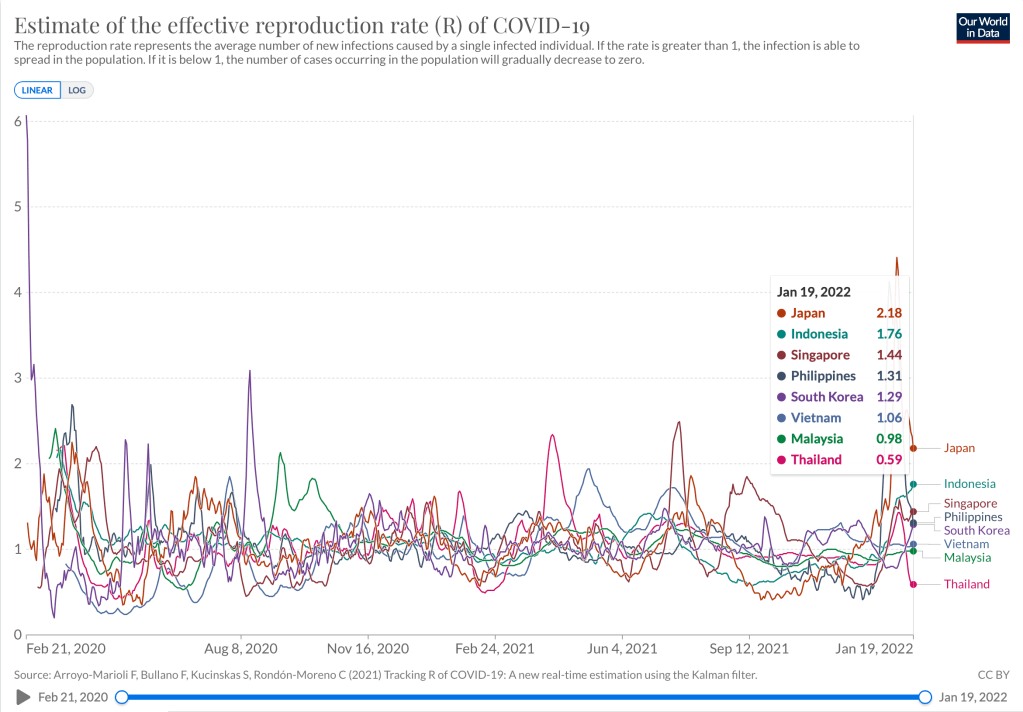 Compared to the other countries in Southeast Asia and select Asian nations (Japan and South Korea), the Reproduction rate is highest in Indonesia, followed by Singapore, South Korea and Japan for this week. These countries are seeing the nth wave (for example Japan is in its 5th wave) and, except for Indonesia, are seeing the highest numbers in the pandemic. With the Rt of Indonesia now at 2.33, the country prepares for an estimated 100,000 daily cases in the next week or two.