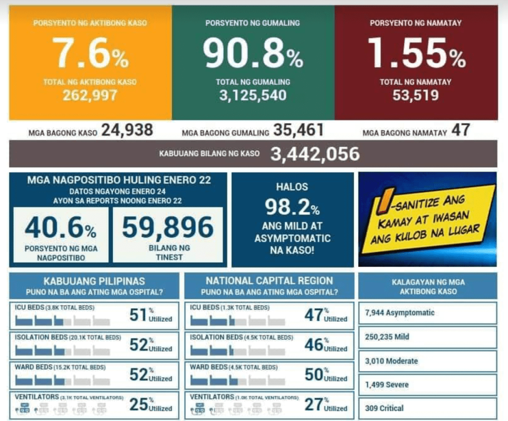 The Health Agency reports 29,929 new cases based on 69,014 tests with a positivity rate of 41.8% last January 21. With more recoveries than active cases reported today, the active cases slide a little lower to 273,580 with more than 98% of them being mild.