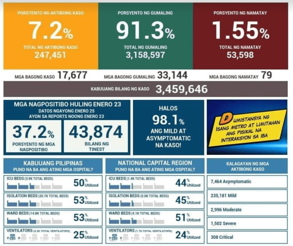 Today, the Health Agency announces 18,191 new cases based on more than 61,000 tests done with a positivity rate of 35.2% last January 25. As more recoveries are noted, the active cases are down to 226,521 with close to 98% being asymptomatic or mild.