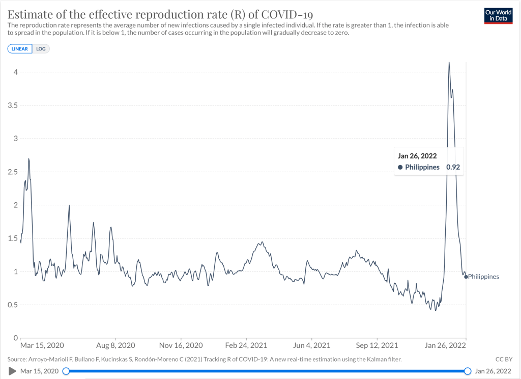 The lower positivity rate and lower health care utilization is due to the lower cases now in the National Capital Region (including CALABARZON and Central Luzon). This also accounts for the drop in positivity rate as the cases begin to recede in the epicenter. However, the rise of cases in the provinces continue and with less testing capacity and financial capability, there may be some disconnection in the testing and positivity rate in these areas. For now, we remain blind to the situation as the Department of Health has not had a regular daily data drop since January 15, 2022. Hopefully, as more people recover from quarantine or isolation status in the Health Agency, we will soon see more realistic numbers to make better projections.