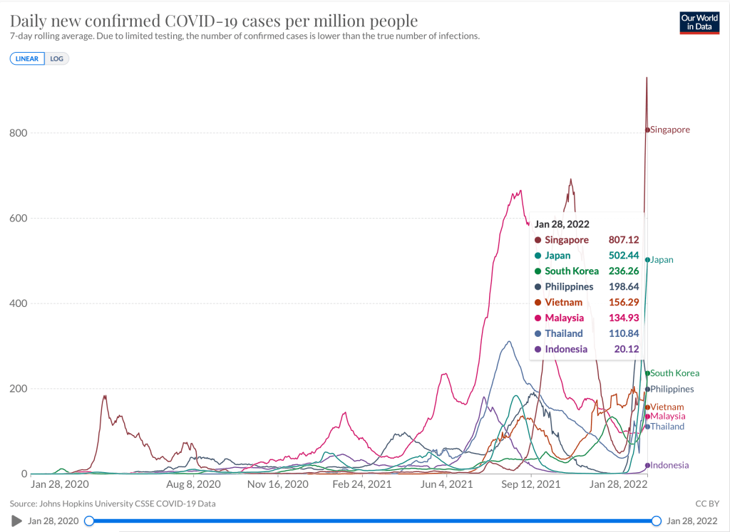 As reference, based on population size (per capita), it is Singapore that has an overwhelming number of cases at 807 followed by Japan, South Korea and the Philippines. Indonesia is at 20 per million population (>11,000 new daily cases) and at the bottom of the list, mainly due the sheer size of the people in the 4th most populous nation in the world.