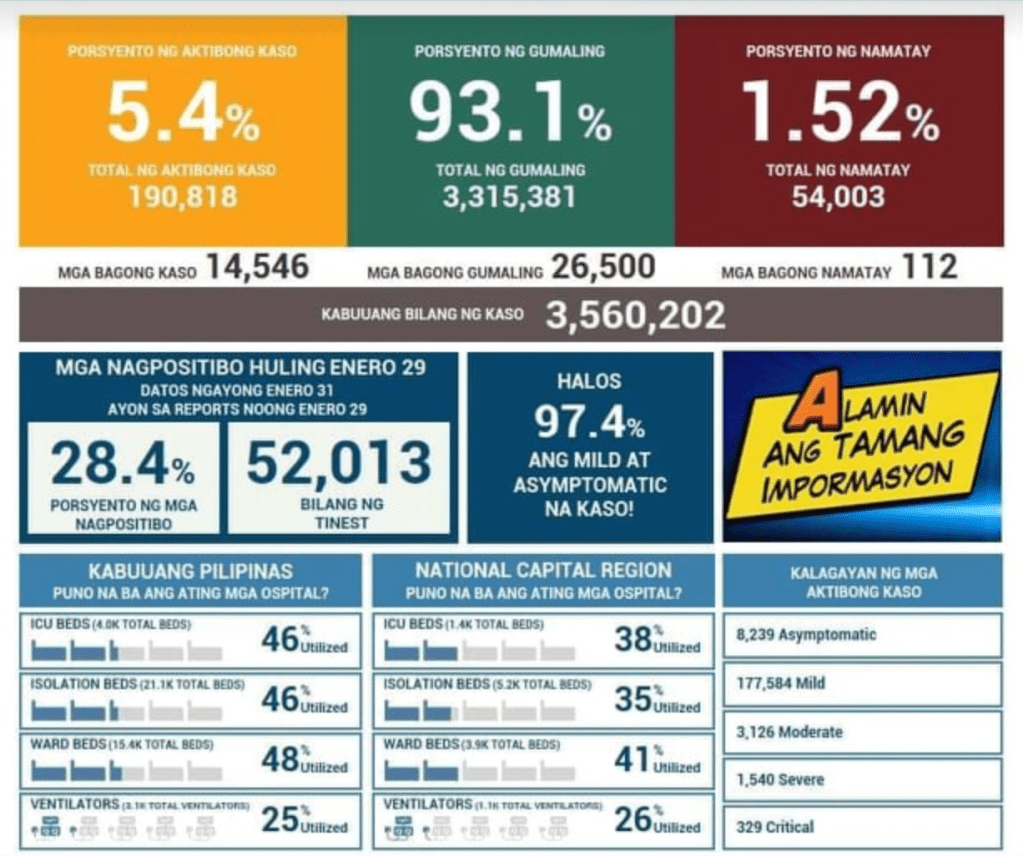 The Health Agency reports 14,546 new cases based on 52,013 tests with a positivity rate of 28.4% done last January 29. With more recoveries than active cases, the active cases drop to around 190,000 – 97.4% of who are asymptomatic or mild.