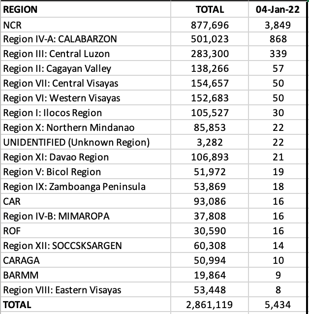Tuesdays are usually low cases days. That’s because these are tests done on a Sunday. Today was an exception to the rule as the Health Agency announces 5,434 new cases based on 24,855 tests done last January 2, a Sunday, with a skyrocketing 26.2% positivity rate. There are cases that are still being validated, so the unreported cases today will still be reckoned in the days to come. With today’s numbers, the active cases jumps close to 30,000 with 80% of them being mild. Notice, however, the jump in hospital utilization in the NCR to 36% and the ICU to 35% from a previous 25%.