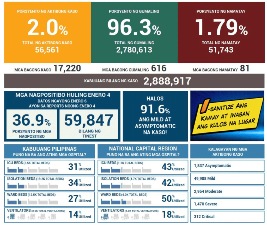 Today, the Health Agency reports 17,220 new cases based on almost 60,000 tests done last January 4, 2022 with a staggering positivity rate of 36.9%! Because the testing facilities can only do so many tests in a single day, we will never see the real picture of the daily new cases because of the limitation also in testing capacity. This brings the total number of active cases to over 56,000, with around 90% of them being mild.