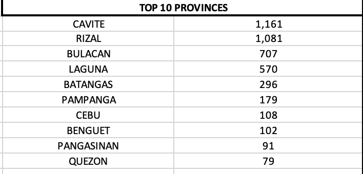 Cavite and Rizal provinces how report quadruple digits each. 14 of the 17 LGUs in NCR are in the top 20. With high numbers in NCR, why are not all the 17 LGUs in NCR in the top 20? Because other LGUs in other areas in Cavite, Rizal and Bulacan are seeing a dramatic rise in cases as the fewest cases in the list for the top 20 is 168 – with the city of Dasmariñas in Cavite taking the spot.