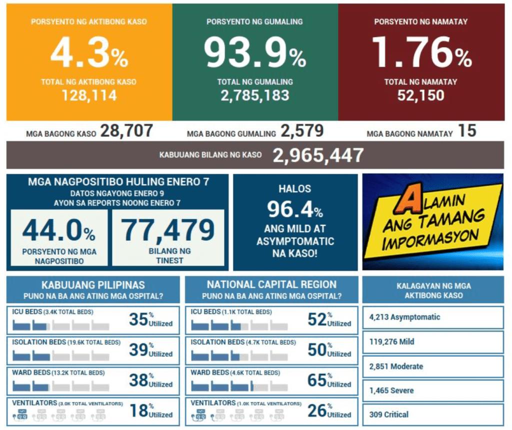 With 77,479 tests done on January 7 and a positivity rate of 44%, the Health Agency reports 28,707 new cases today as the active cases climb to more than 128,000. Majority of the active cases are mild. Hospital ward beds are now filled at 65% while ICU utilization is at 52%.