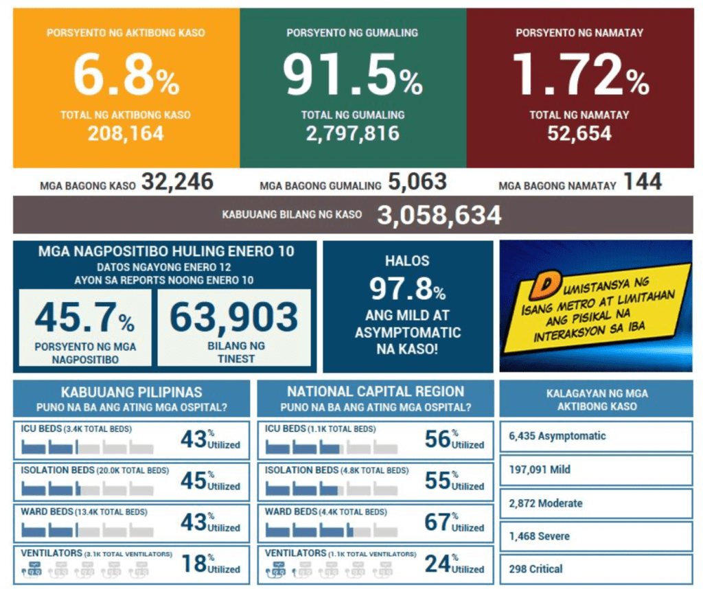 [Note: There is no data drop for January 11, 2022. You can, however, access the individual regions and cities and municipalities at the website of the Department of Health https://doh.gov.ph/covid19tracker. NCR had 15,445 cases yesterday and accounted for 55% of the total cases in the country. CALABARZON reported 5,976 and Central Luzon with 3,102 cases. 96 ROFs were added in yesterday’s tally as the cases in the regions outside of NCR start their steady rise.]