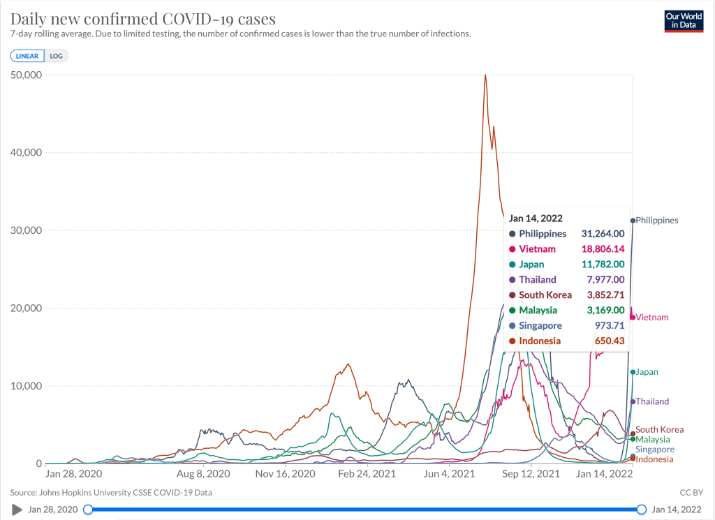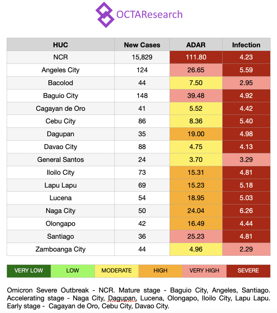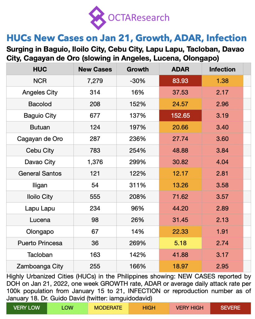 Prof. Guido David drills down the Highly Urbanized Cities in the Philippines in the midst of the Omicron surge. While NCR continues to have very high cases, its growth rate has considerably slowed down and is now on a negative trajectory. The Rt is down to 1.38, which means that, in spite of the RT-PCR only reports being churned by the Health Agency, there is an actual decline in cases with ADAR at 84 per 100,000 population. On the other hand, other cities are seeing a significant rise in numbers, especially Baguio City with an ADAR of 153 per 100,000 population and Davao City which saw 1,376 new cases yesterday, to lead among all LGUs in the country with an Rt or 4.04.