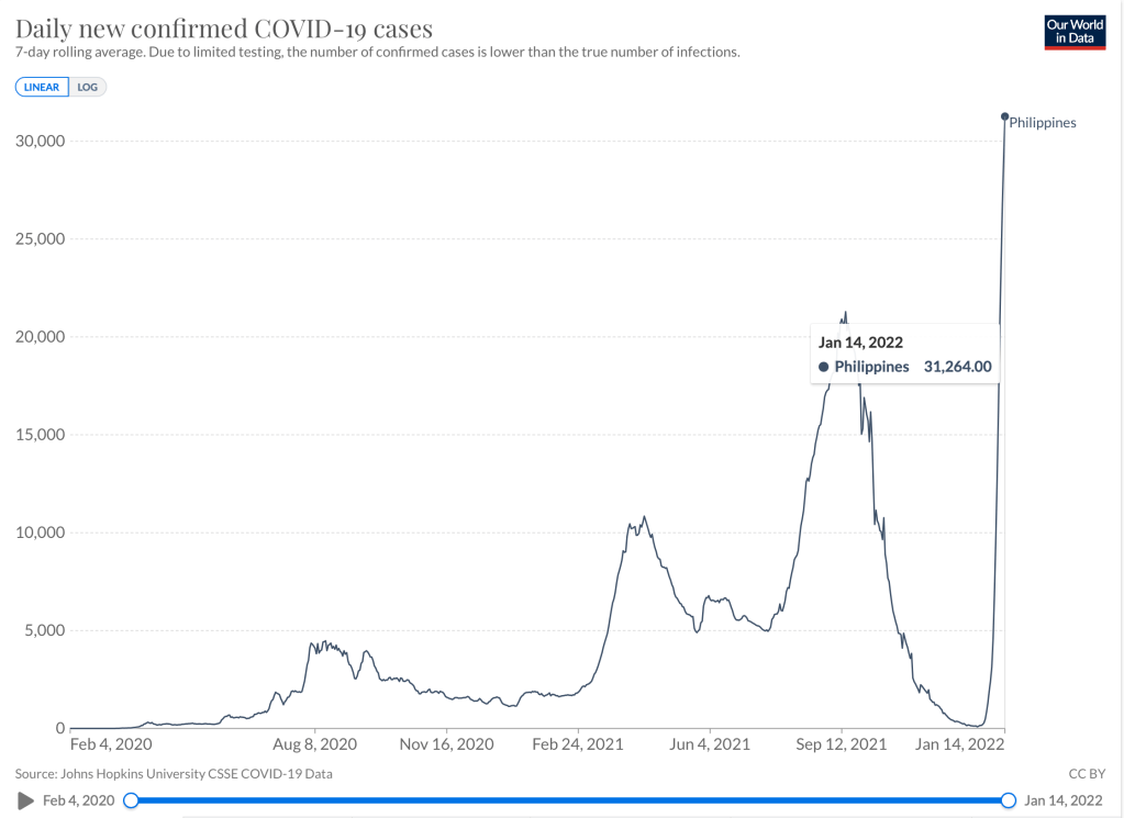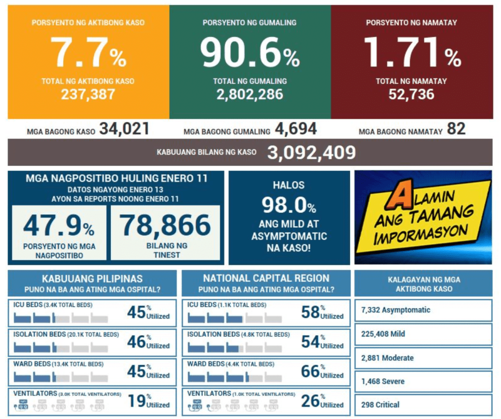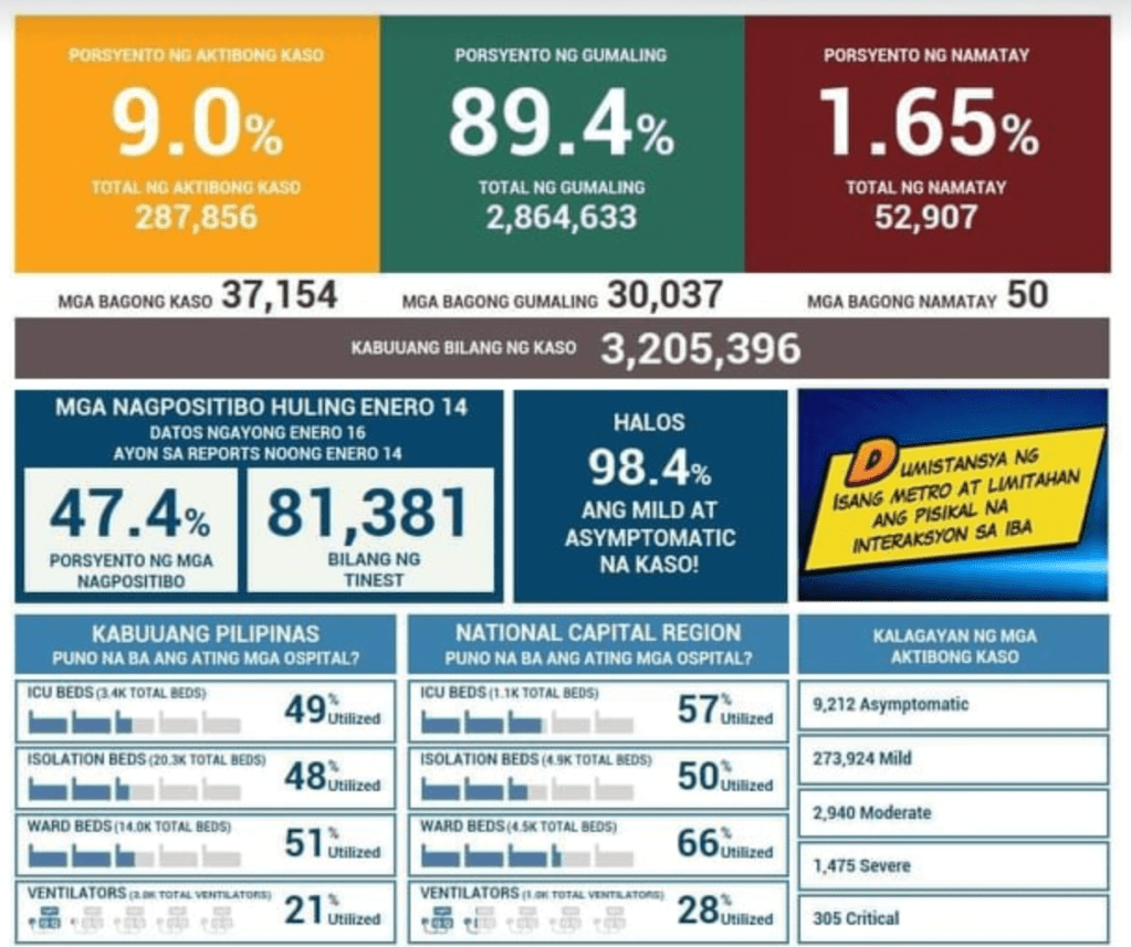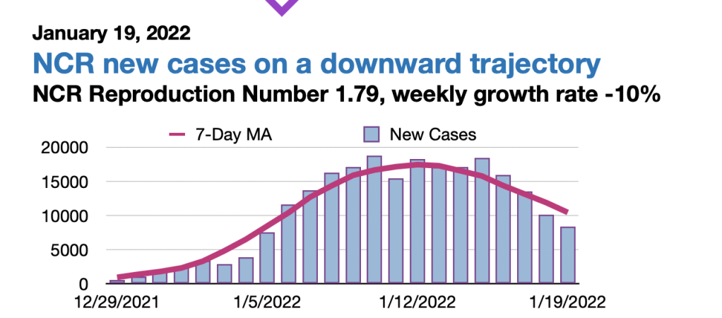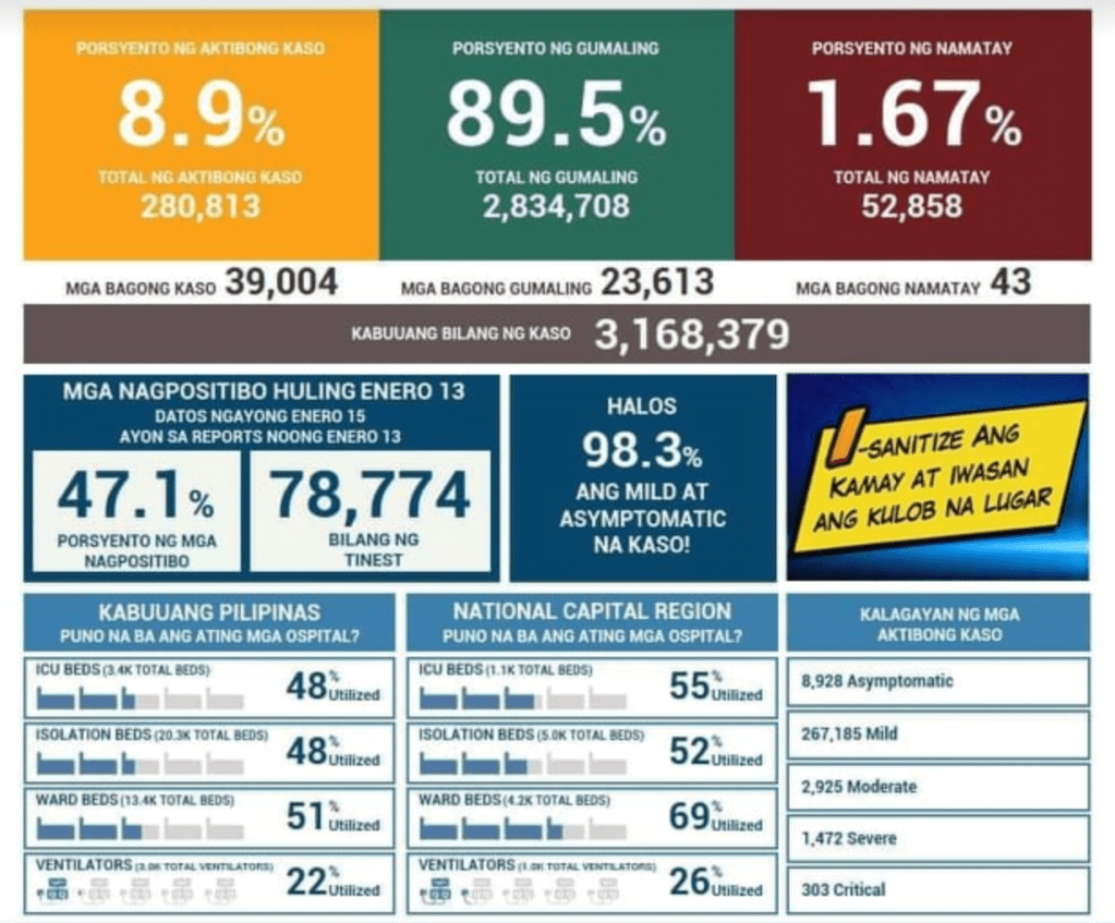 The Health Agency announces 30,552 new cases based on more than 68,000 individuals tests with a positivity rate of 45.1% last January 20. With more recoveries than new cases, the active cases slow down a tad to a little above 280,000. More than 98% of the active cases were mild or asymptomatic at the time of testing.
