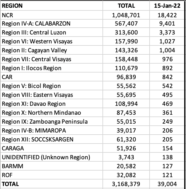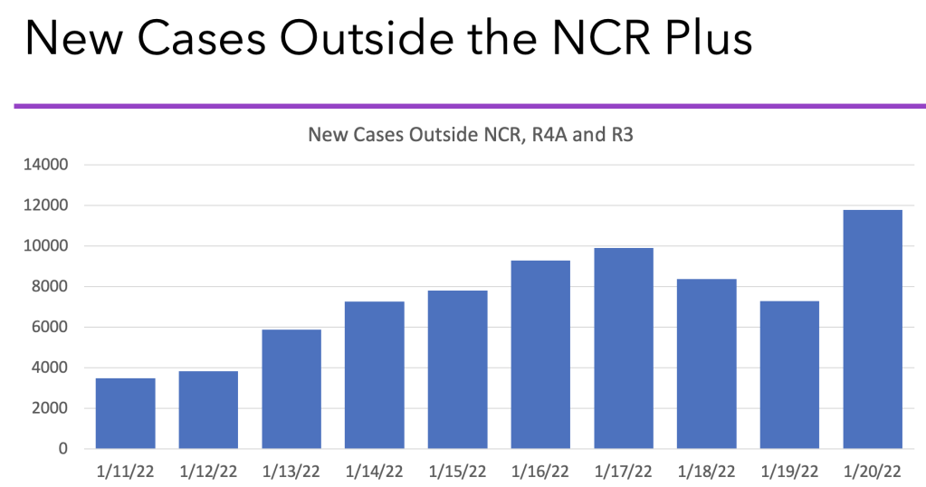 In regions outside of NCR, Region 4a reports 6373 cases while Central Luzon had 2876. Other regions with more than 1000 cases include: CAR 1134, Ilocos 1653, Cagayan Valley 1140, Western Visayas 2003, Central Visayas 2269, Davao Region 1552, and Northern Mindanao 1052.