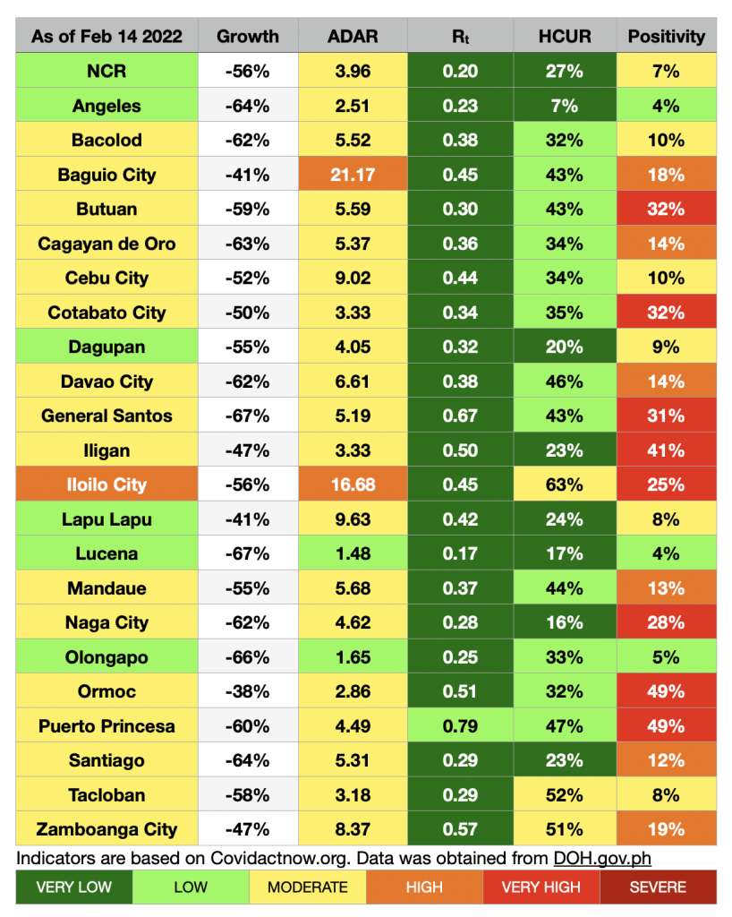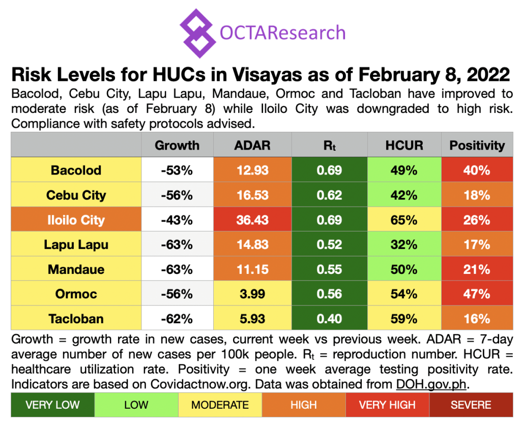 From OCTA RESEARCH [Prof. Guido David shares] the rundown of risk levels for highly urbanized cities in the Visayas as of February 12. While there is a decline in the weekly growth, the positivity rate in Iloilo City (1 in 4 testing positive) and Ormoc (1 in 2 testing positive) are at severe risk. Health care utilization is a moderate risk for Iloilo City and Tacloban (>50%), while ADAR (average daily attack rate) remains high in Cebu City, Iloilo City and Lapu Lapu (>10 per 100,000 population). While the reproduction number remains less than 0.5 in many areas, the decline may be due to the limited testing that is being done (many doing rapid antigen tests and not captured by the government) and testing only when patients need to be hospitalized for either COVID or nonCOVID cases (eventually ending up as + for SARS-CoV-2).