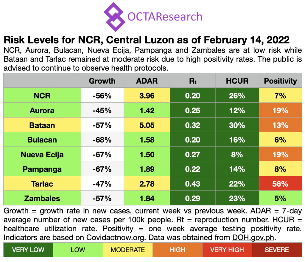 Based on the data provided by Prof. Guido David, the risk level for NCR and Central Luzon has considerably improved and shows that NCR, together with majority of the provinces in Central Luzon are now at low risk in various variables: ADAR, Rt, healthcare utilization rate. Only positivity rate remains moderate to very high in all (except for the province of Zambales), which shows us testing in these areas.