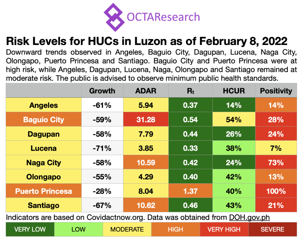 This statement comes based on the OCTA Research Monitoring data [through the effort of Prof. Guido David] on the risk levels for Highly Urbanized Cities (HUCs) as of February 8. While there is an overall downtrend of cases, this decline may not be accurately reflecting the exact number of people with COVID19. Baguio City still has a very high ADAR (average daily attack rate) and a positivity higher than the national average. Notice that ALL these HUCs, except for Lucena City has a positivity at high, very high or severe. For example, Puerto Princesa’s growth, while on a decline has a Rt of 1.37. This is being greatly affected by the positivity rate of 100%. Everyone who tests there is positive.
