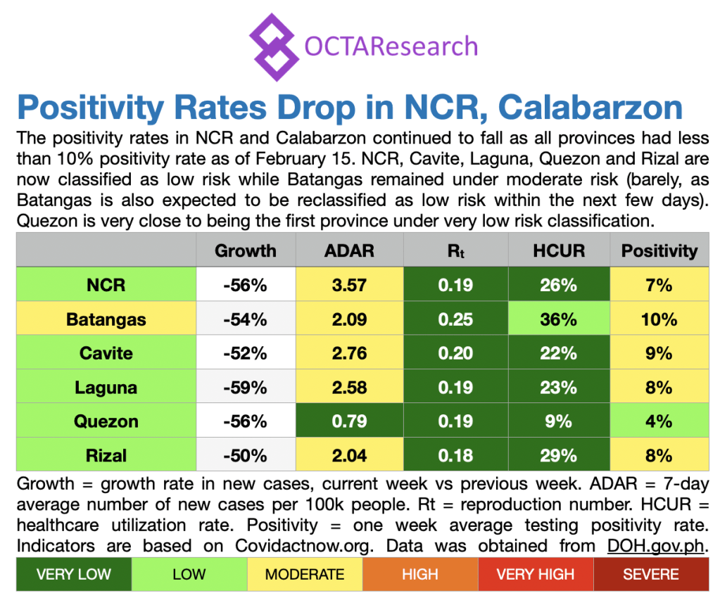 Prof. Guido David (through OCTA Research) provides information on the positivity rates in NCR and all provinces in Region IVA (CALABARZON). As the numbers in both NCR and CALABARZON continue the decline, only Batangas remains in moderate risk because of the relatively higher Health Care Utilization Rate (36%) and a 10% positivity rate. The rest, however, are at low risk with the province of Quezon having an ADAR <1, Rt of 0.19, HCUR at 9% and positivity at 4%!