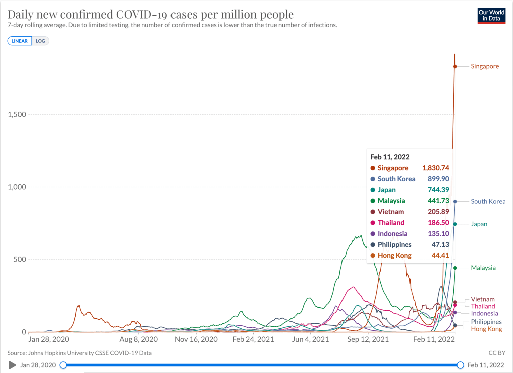 The effective reproduction number is highest for South Korea and Singapore, and all nations except for the Philippines with Rt >1.0. Japan, while owning the highest cases in the region has a positivity rate of 44% as of February 10. South Korea has a positivity rate of 18%. Vietnam owns the highest positivity rate in the region at 50% (meaning 1 in 2 test positivity). As omicron rages on, the effective reproduction rate may not translate to the actual situation in the respective countries as testing takes a back seat in how the pandemic is addressed.