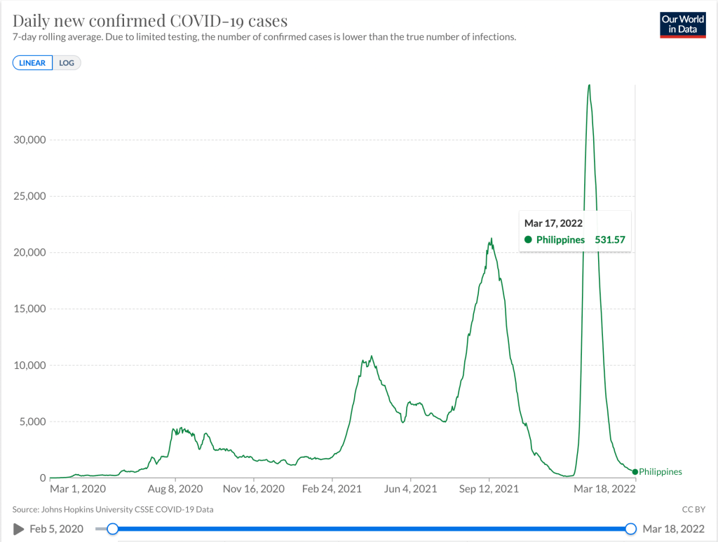 The Philippines continued its low cases streak but has most likely hit a trough in spite of the lower reproduction number (Rt = 0.53 +/- 0.05). We ended last week with a 7-day average of 590 daily cases and as of yesterday averaged 531 daily cases (which isn’t a significant decline compared to the lower cases we had in December 2021, after the delta surge and before the omicron wave. Majority of the daily cases remain concentrated in the National Capital Region, most likely because of the density of the region and that testing is more accessible and plentiful in Mega Manila.