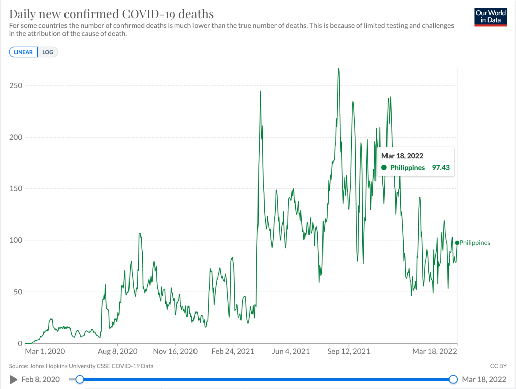 Based on a per capita (number of cases per million population), South Korea led the pack. And while Brunei may have around 2150 daily cases only, the small nation of half a million people was enough to push it into second spot with 4860 cases per million population. Hong Kong comes in third with 3500 per million, Vietnam fourth with 2800 per million and Singapore fifth with 2000 per million. The Philippines and China are the sole nations with single digit per million population. The data may not be a reflection of the actual situation as the stark contrast is that the Philippines has decreased its testing capacity by limiting it to A1, A2 and A3 and contact tracing is not routine anymore. On the other hand, China aggressively tests and does contract tracing in almost every province or city where there is an outbreak of cases noted.
