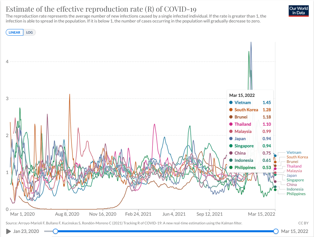 With that data, the reproduction rates of the various countries show that Vietnam and Korea remain critical. The upcoming week will see Vietnam continue to report a slight uptick in numbers and should be peaking anytime soon. South Korea has lower Rt this week compared to last and is seeing a slight decline in numbers. Most likely, it has reached its peak. With aggressive testing in Korea, 1 in every 20 individuals are currently testing positive. Brunei has also peaked and are seeing a slight decline in numbers. Those with Rt < 1.0 are Malaysia, Japan, Singapore, China, Indonesia and the Philippines.
