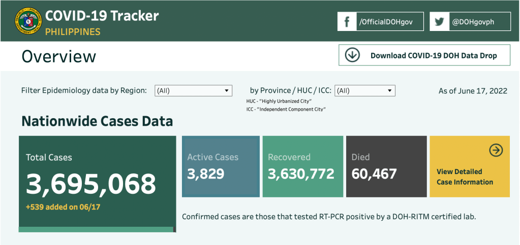The DoH announces 529 cases today with 3.8% positivity rate for June 20, 2022. The NCR accounted for 279 (53%) of the cases today. This was led by 12 LGUs that reported double digits. QC led the pack with 59 cases. Makati and Manila had 36 each. Parañaque with 31, Pasay City 18, Las Piñas 16, Marikina and Pasig with 15 each, Mandaluyong with 13, Caloocan with 11 and Taguig and Muntinlupa with 10 apiece. Only Pateros had zero covid today.