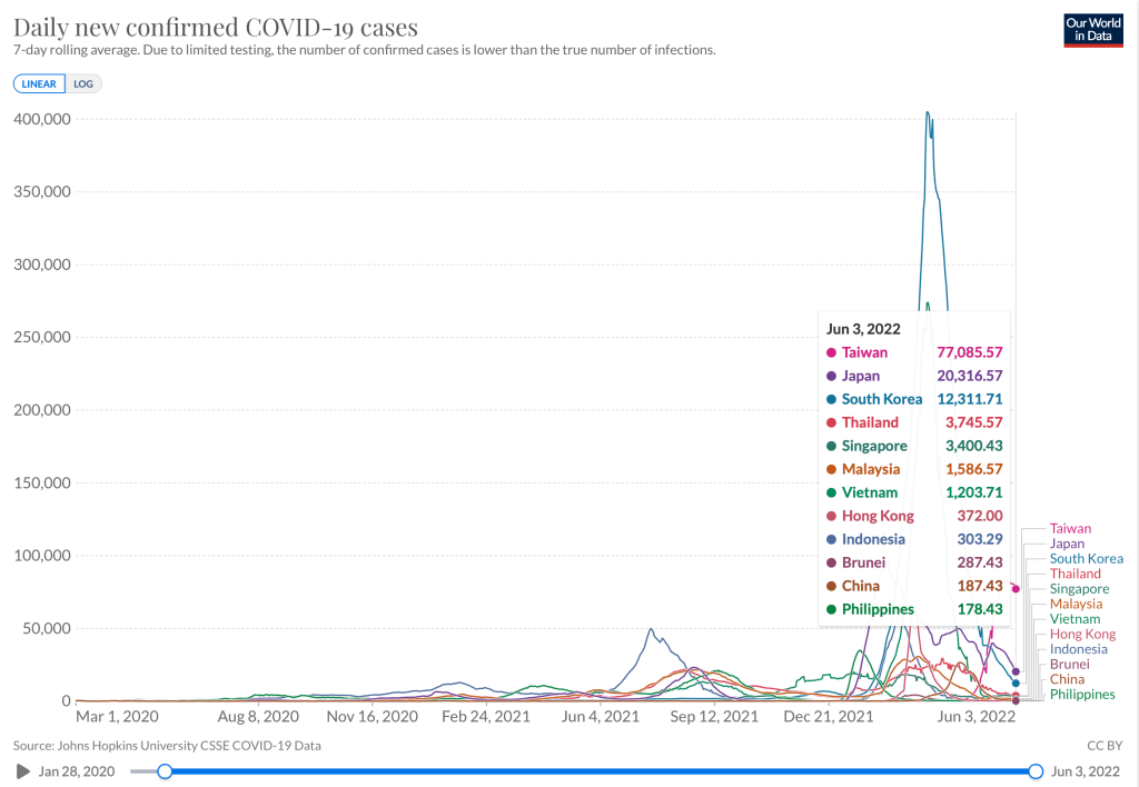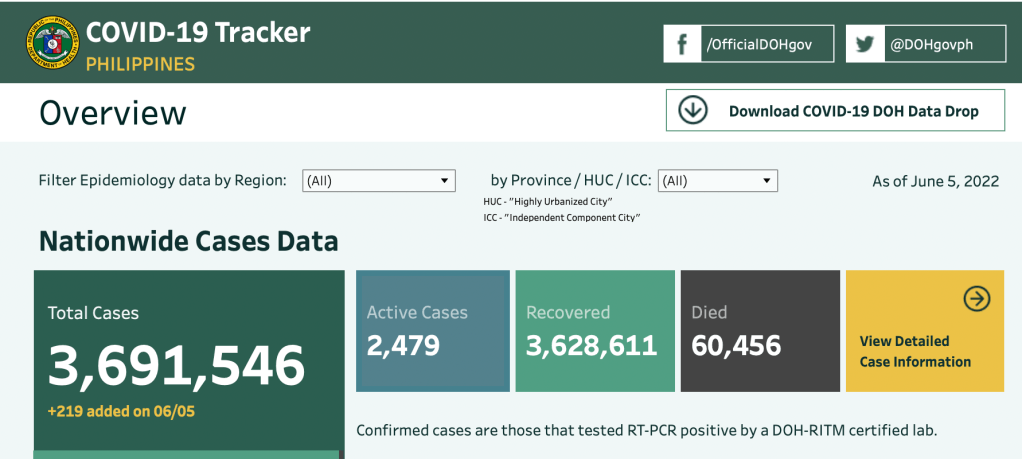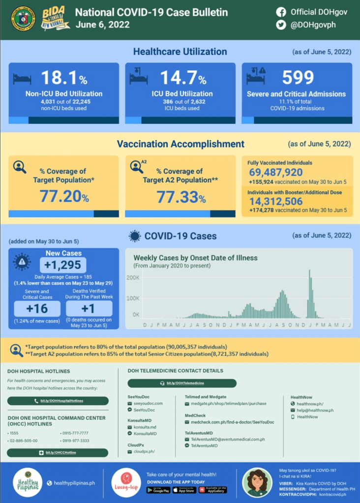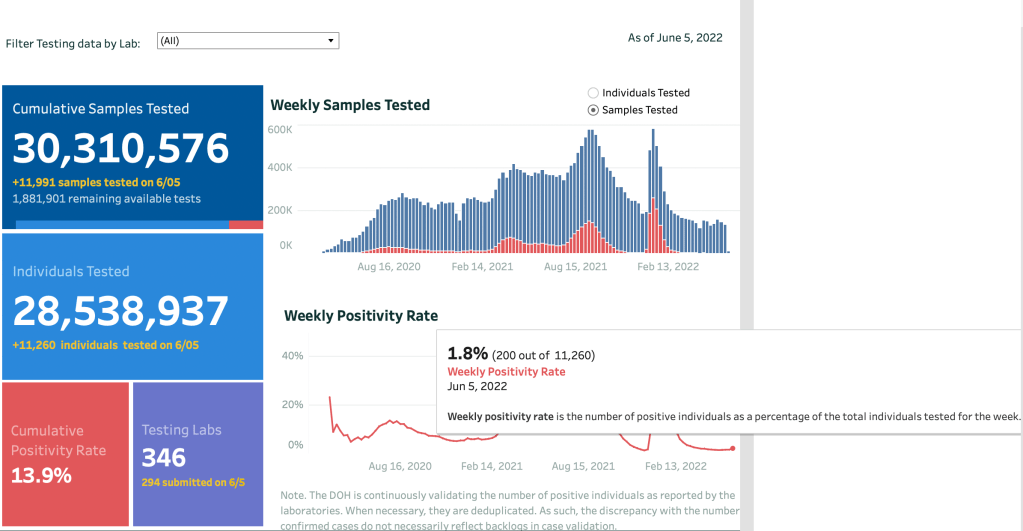 The Health Agency announces the new cases for the week of May 30-June 5, 2022 was at 1,295. This means that we had a 7-day average of 185 cases/day or a 1.4% lower number of cases compared to May 23-29, where the cases for that week totaled 1,317 (or a 7 day average of 188 daily new cases). These numbers mean – THERE WAS NO CHANGE IN THE WEEK ON WEEK NUMBER OF CASES.