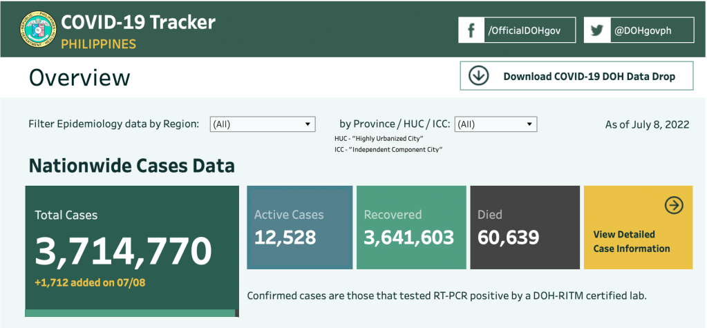 The Health Agency announces 1,712 new cases and 14 added deaths today as the 7-day positivity rate continued to climb to 9.2%. The NCR owned 748 or 44% of the cases for the day.