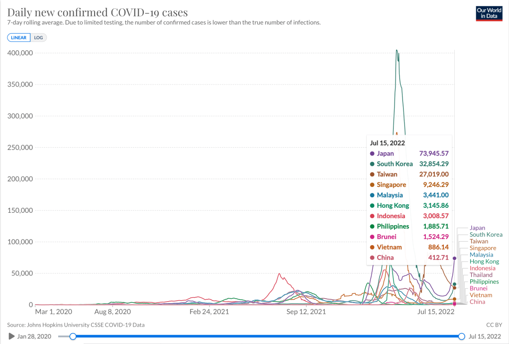 The rising global cases of COVID-19 fueled by the omicron sub variant BA.5 (and other sub variants in other parts of the world) is seen (and felt) in East Asia as the cases in this part of the world are seeing dramatic increase in infections. Data is to be interpreted WITH CAUTION as the number of reported cases are based on PCR in most countries and self-testing and self-reporting is not done in many nations, including the Philippines.