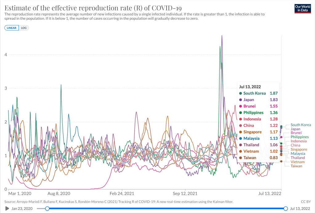 Using the effective reproduction number, if the rate is greater than 1, the infection is able to spread in the population. If it remains below 1, then the number of cases occurring will gradually decrease. That is why the Rt is an important indicator of infection control in pandemic. All countries, except Taiwan has Rt>1.0. This is led by South Korea and Japan. The Philippines has a reproduction number of 1.36 (+/- 0.05) as of July 13, 2022.