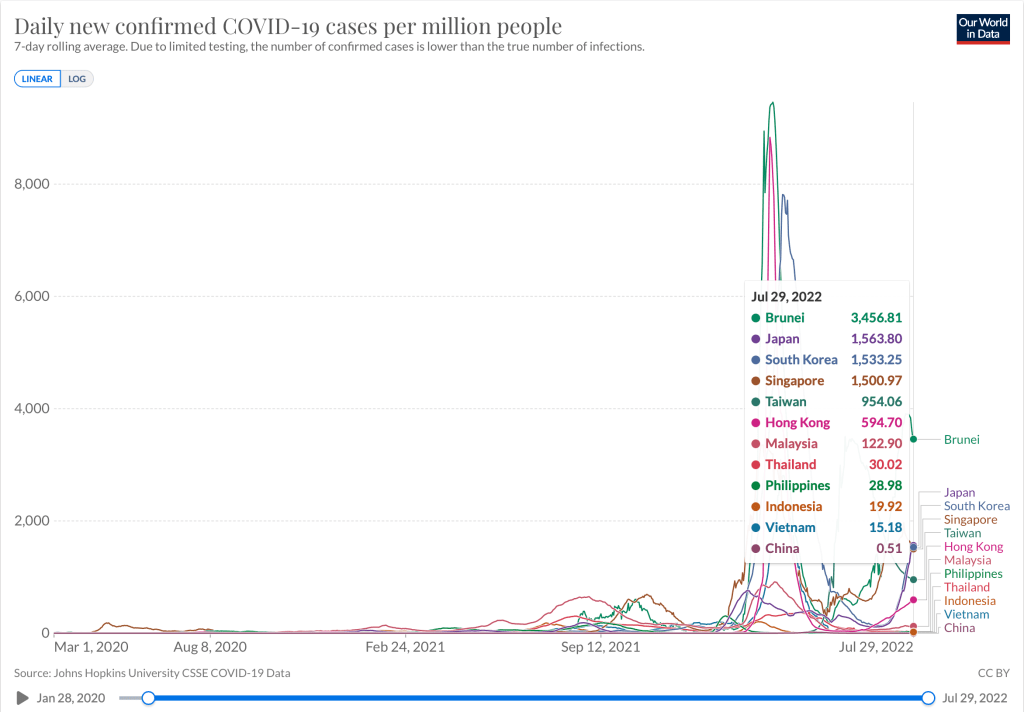 The spotlight the past weeks has been on Japan and South Korea where they are seeing a fresh wave in their most recent surge of cases. Japan has exceeded the 200,000 daily new cases while South Korea is seeing almost 100,000 new daily cases.
