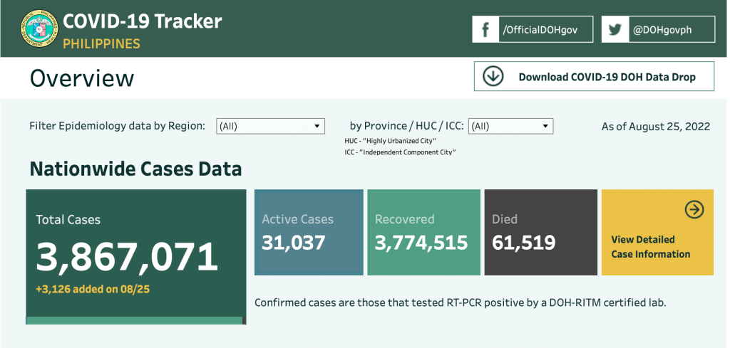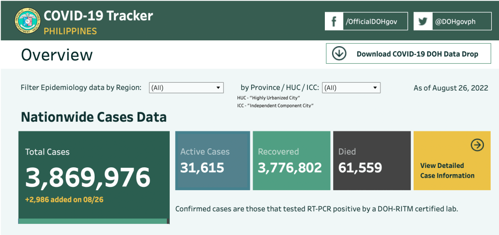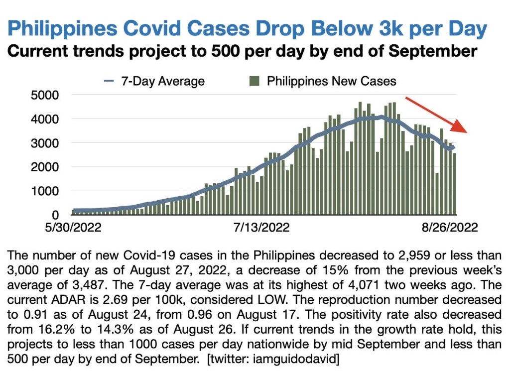 The 7-day average based on August 27, 2022 data is at 2892 daily cases, which the NCR, which owns around 30% of the national cases continues to decline in Rt and positivity. If the current situation maintains the same mathematical modeling, we expect lower cases by the end of September. Hopefully, these would translate also to more reliable numbers as many of the cases in more highly urbanized areas in Metro Manila and the country are not counted because the Philippines only includes those testing positive by RT-PCR.