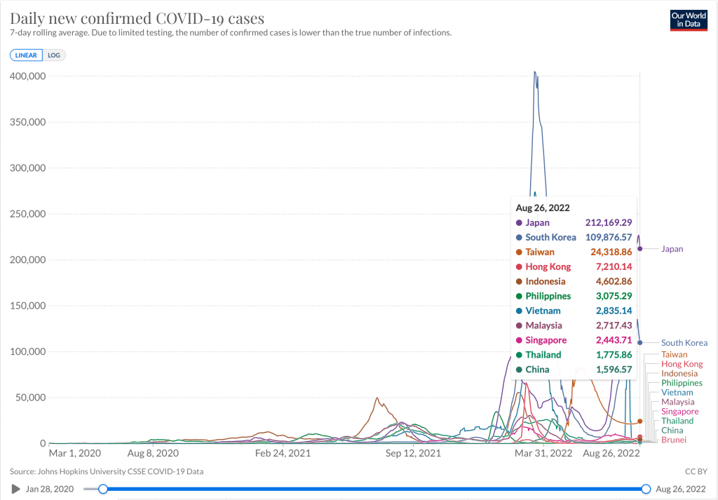 Japan and South Korea remain to be the only countries reporting six digit daily cases, while Taiwan continued to report five digits.