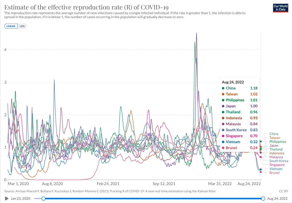 Reproduction rates of all countries in the East Asian region are stable (which means that the following week will more or less provide the same statistics with a slow decline among countries with R> 0.9), while countries with R<0.8 (Malaysia, South Korea, Singapore, Vietnam and Brunei) will continue to see continued decline in cases as natural immunity from infection spreads across the region.