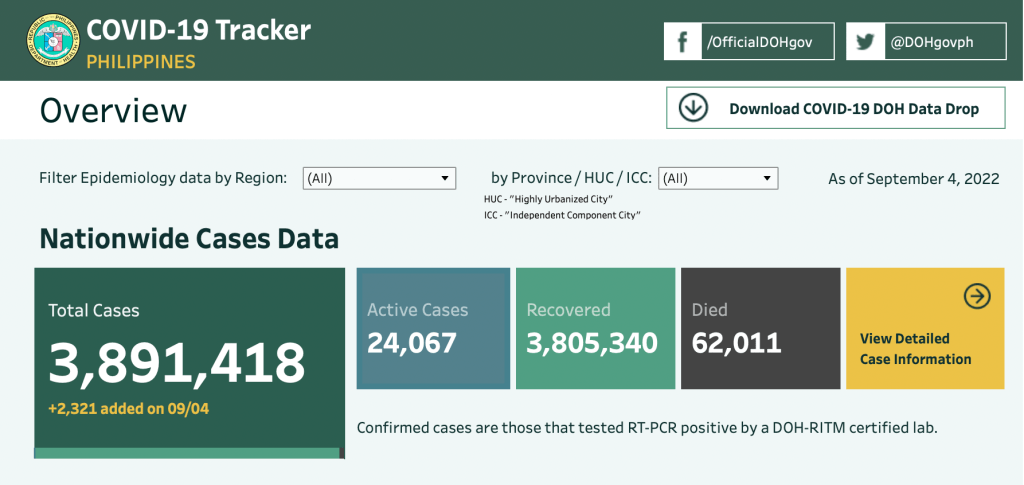 Provinces or HUCs with more than 50 but less than 100 cases based on RT-PCR results were: Laguna 84, Rizal 75, Batangas 55, Bulacan 83, Iloilo 61, Cebu 85, Davao del Sur 72 (with Davao City owning 67).