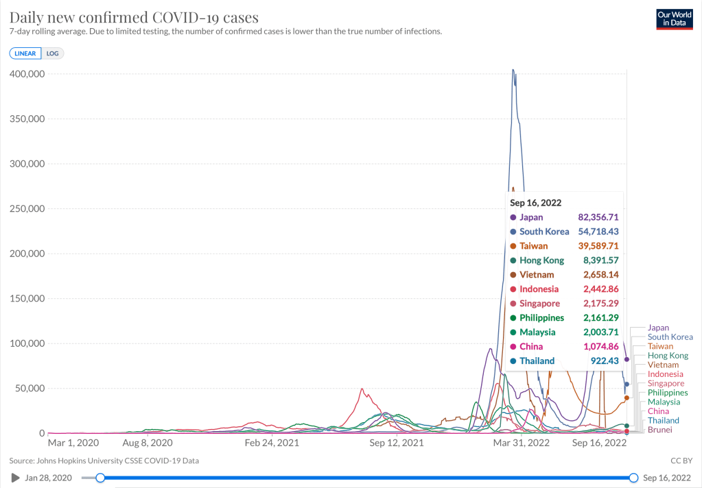 Japan, South Korea and Taiwan continued to lead the region with 5-digit numbers, but in terms of per capita (cases per million population), Taiwan, Hong Kong and South Korea lead with 4-digits per million population.