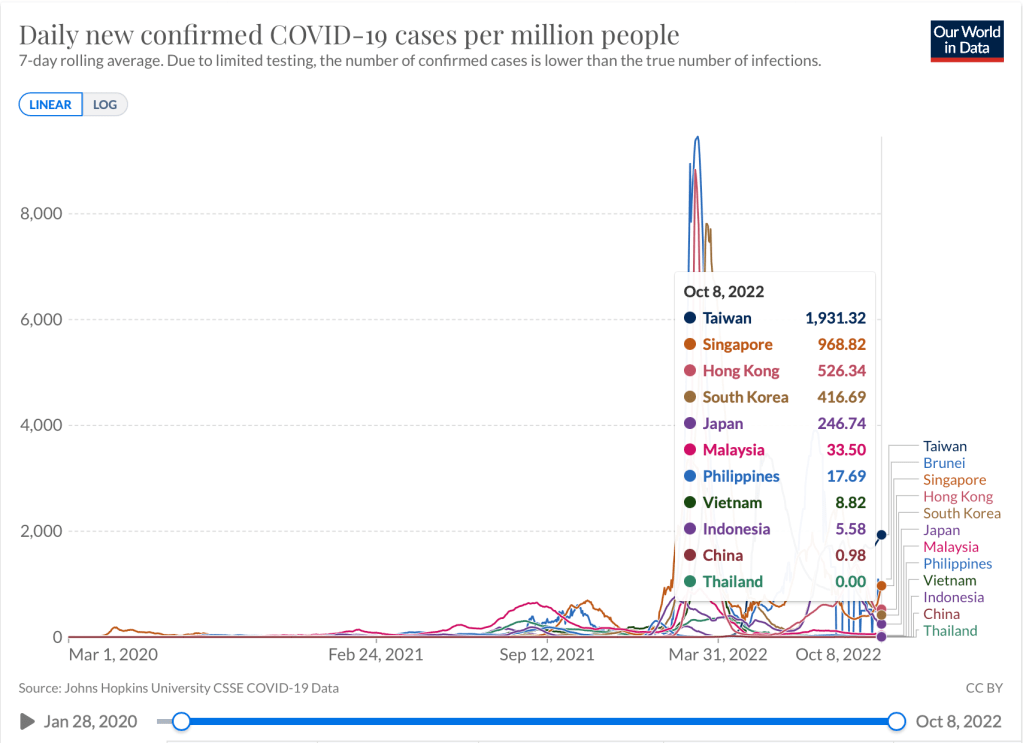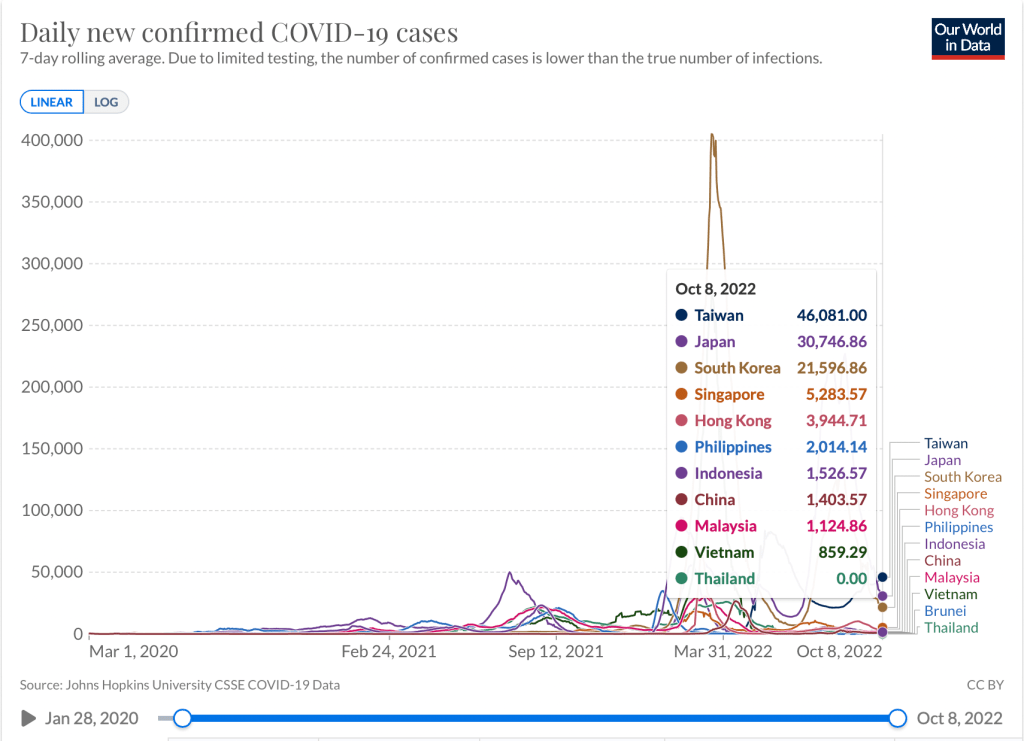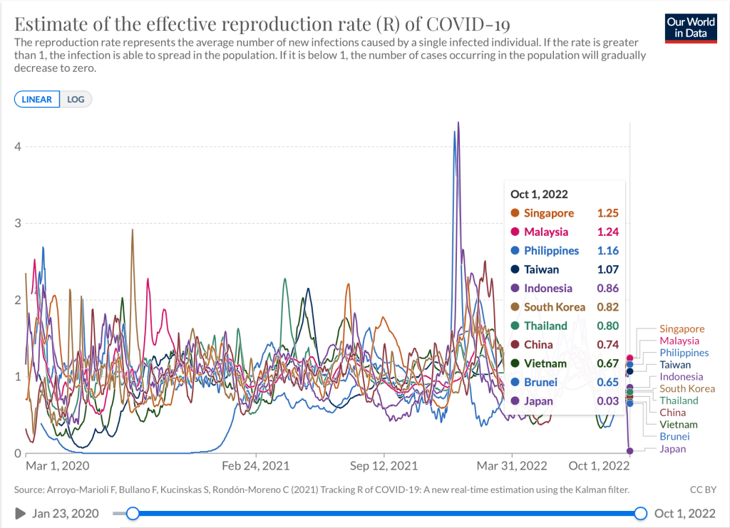Globally, Europe now comprises more than 50% of the world’s daily cases. In East Asia, Taiwan continued to see rising cases as the Rt remained above 1. Japan sees a dramatic drop in cases, not because there are less COVID cases see, but because in the way the reporting is done. The doctors are not mandated to fill up each and every report for all cases of COVID-19 any longer in the country. With the BA.5 and BA.4 and its sub variants dominating the globe in time for the winter season, some of the countries are notably seeing changing landscapes with many under testing, and simply living with the virus.