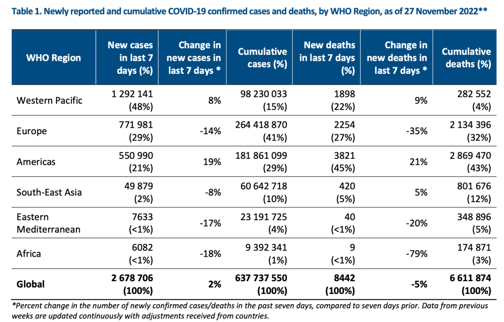 The world saw a very slight upward change in numbers for the week of November 21-27, 2022 compared to the previous week. However, the number of weekly deaths continued to decline by 5%.