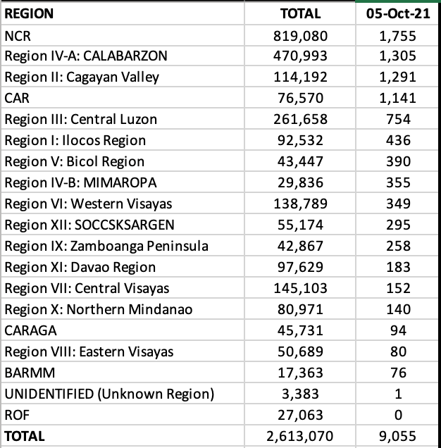 NCR recorded a high 23% of the total cases today (from previous < 20% daily shares), and CALABARZON and Central Luzon back in the 1-2-3 rankings. Cagayan Valley came in fourth and the other regions in Northern Luzon (Ilocos Region and CAR) take a respite from the daily high numbers (most likely delayed reports again).