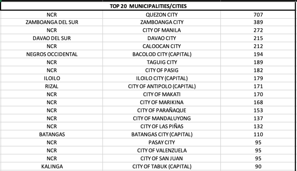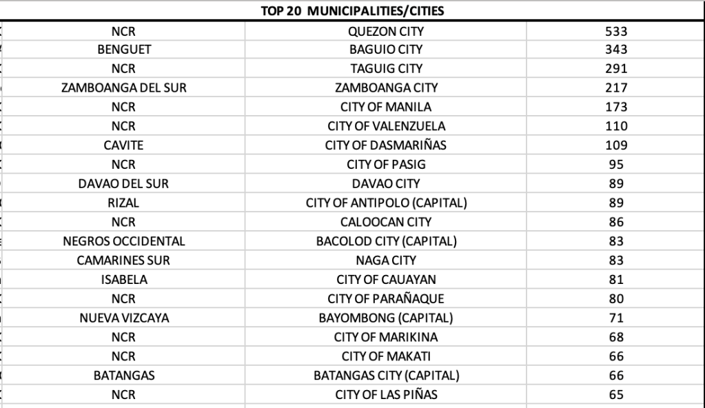 And among cities/municipalities, 13 of 17 LGUs in NCR are among the top ten. The surprise of the day is Zamboanga City that zipped into second spot. Davao City, Bacolod City, Iloilo City and Antipolo (Rizal) are in the top ten list.