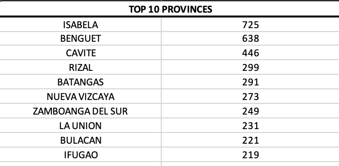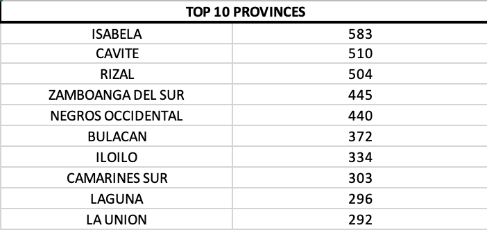 However, on a provincial level, Isabela continued to lead, followed by Cavite and Rizal.
