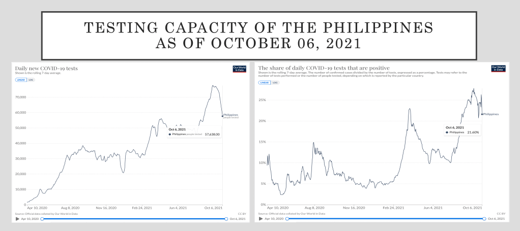 Testing has also considerably declined, but the positivity rate has decreased as well. The decrease in testing can be attributed to the decreasing cases, particularly in the National Capital Region. Why is this so? The NCR (plus CALABARZON and Central Luzon) account for more than 50% of the almost 280 testing facilities in the country. Notice that the positivity rate posted here is still at 21%, but the Department of Health pegs our 7 day average at 16.3% as of yesterday, October 9, 2021.