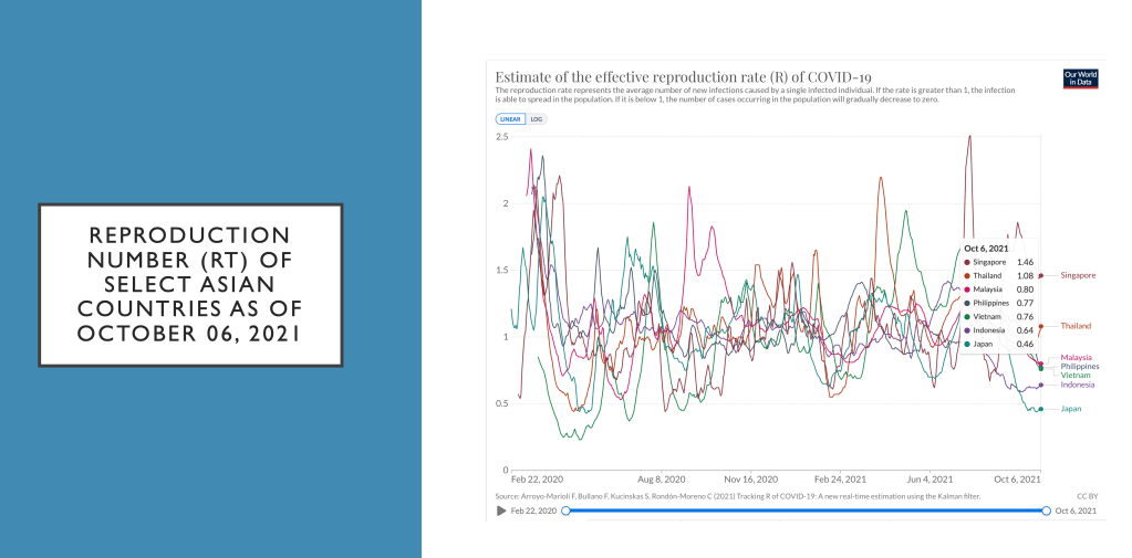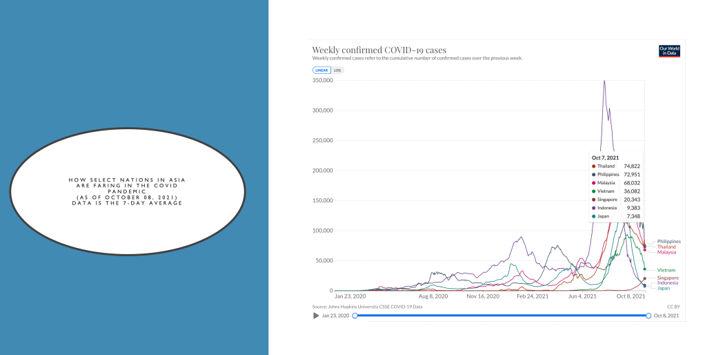 In the ASEAN region and select Asian continent, the total number of weekly confirmed COVID-19 cases as of October 8 was highest for Thailand, followed by the Philippines. Surprisingly, Singapore had more cases this past week with 20,343 cases, than Indonesia that reported only 9,383 cases over the whole week.