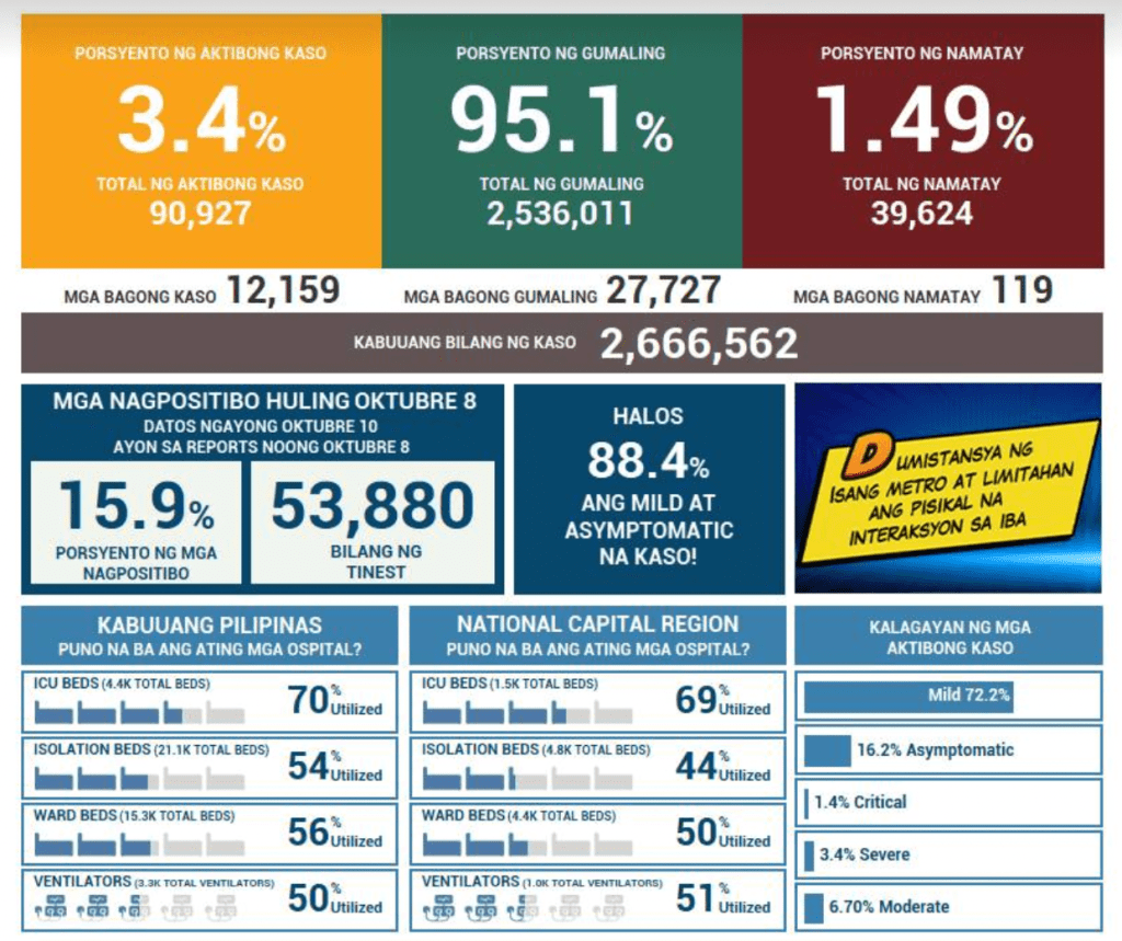 The Health Agency reports 12,159 new cases today. Of course, this will not match their infographics where they point out that the data today is based on reports last October 8 where 53,880 were tested with 15.9% positivity. If this were the case, then we would mathematically have 8500 or so cases in actuality.