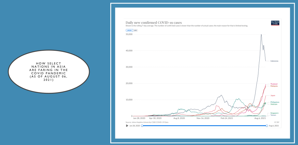 In the graph below are the same countries noted above with rising cases. Notice that while the cases continue to rise in almost all countries, the reproduction number has slowed down in many, with countries like Indonesia, Singapore and Taiwan maintaining their Rt <1.0. By bringing the reproduction numbers below 1, you don’t only slow down the rise but eventually see a decreasing trend in the daily cases, eventually falling to manageable levels over a period of time. The higher the number of daily new cases, the longer it will take to bring down the numbers to manageable levels enough to reopen the economy.