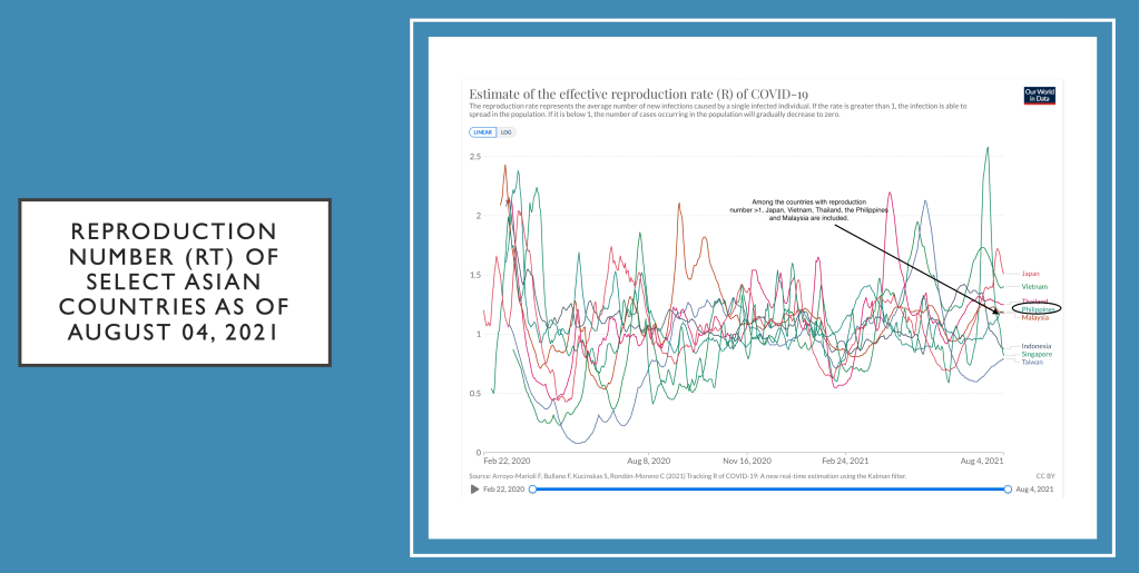 The data of August 3-9, 2021 shows that the current positivity rate is 19% (high) in the Philippines, with the positivity of NCR up at 15%. The reproduction numbers are also increased at 1.79 for NCR.