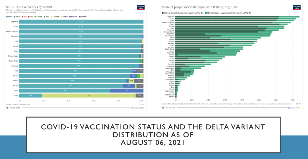Vaccination and the delta variant has been the ultimate challenge at this time. The infographic below shows how the delta variant has taken over as the predominant variant of concern circulating in various countries and the share of people who have been vaccinated against COVID-19, regardless of vaccine brand.