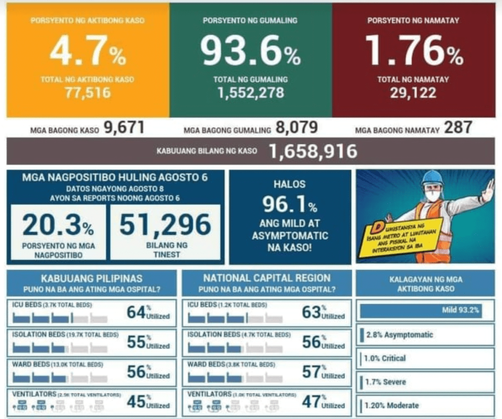More cases today as the Health Agency reports 11,021 new cases for more than 56,000 tests done August 5. The positivity rate is one of our highest at 19.1%! And the active cases are up at more than 76,000 or close to 5% of the total proportion of cases with COVID19. And these are just those that are reported and recorded from RT-PCR tests done in the country.