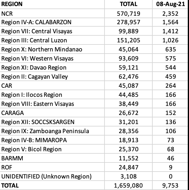 Today, the NCR claims 25% of the total cases for the day with more than 2,000 cases – its new high for this surge. Two regions saw quadruple digits while ten saw triple digit counts.