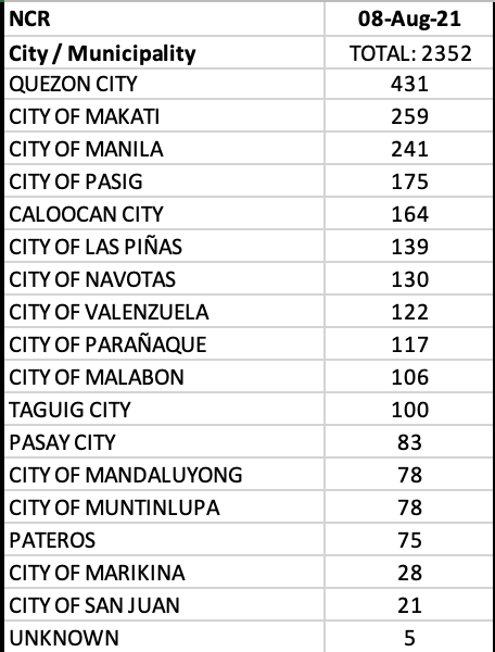 On an LGU level, Quezon City led the day to make 13 of 17 LGUs from NCR be included in the top 20 cities with most cases.