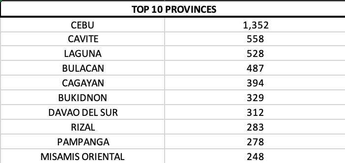 Cavite province had quadruple digits and led on a provincial level. This was followed by Cebu and Laguna, respectively.